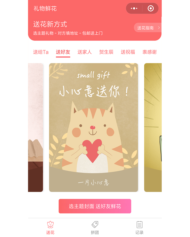 該微信公眾號是專業(yè)的鮮花網絡購物平臺,應用開發(fā)功能模塊有首頁、拼團、記錄等等。